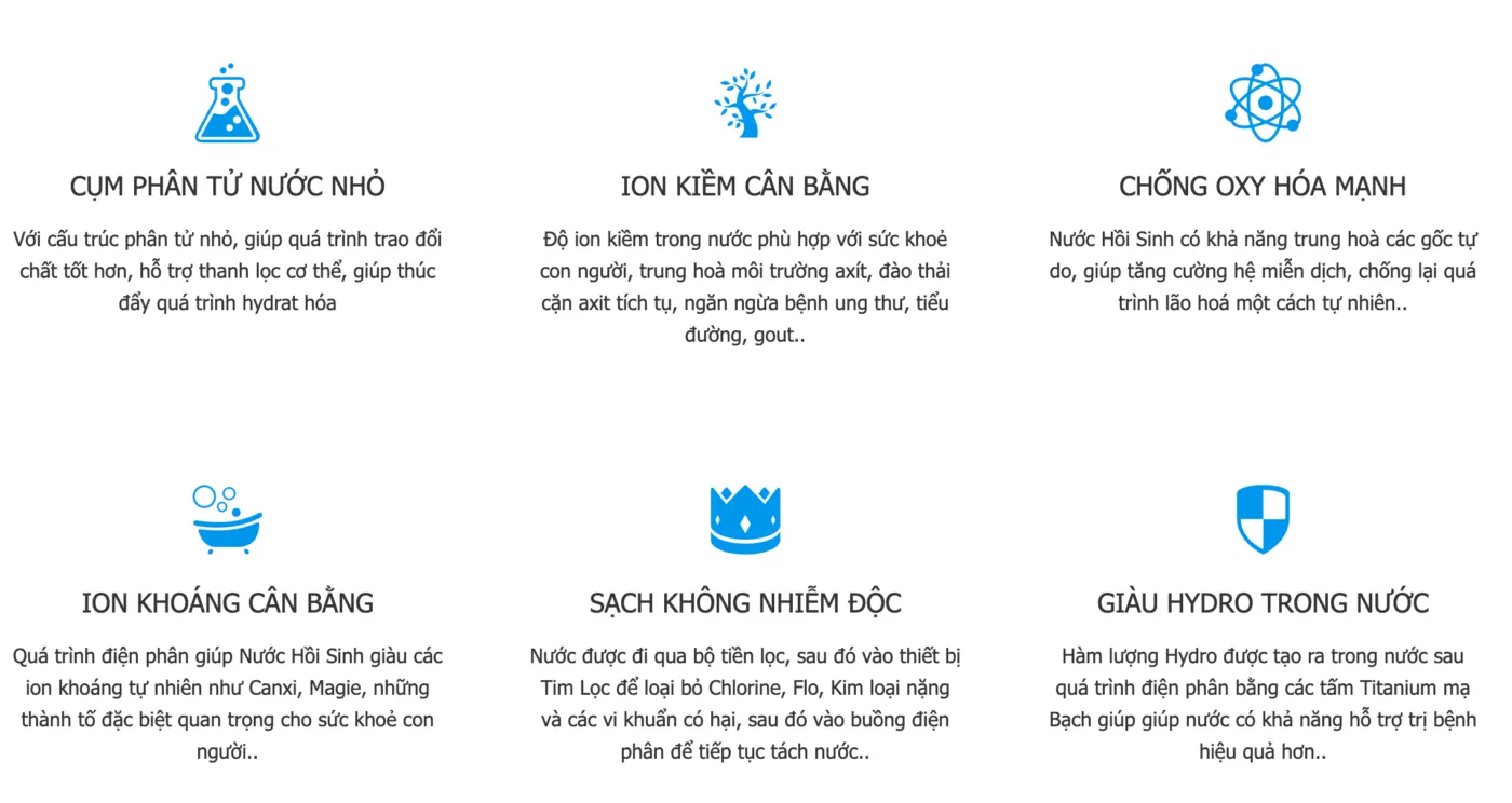 Nước Hồi Sinh™ là loại nước tốt có tính ion kiềm (ionized alkaline) giúp giải quyết các bài toán khó về đào thải cặn axit và cân bằng pH trong máu; có phân tử siêu nhỏ linh hoạt, giúp dễ dàng thẩm thấu, hỗ trợ tốt các hoạt động trao đổi chất trong cơ thể, cải thiện hệ tiêu hoá, thanh lọc cơ thể; giàu hydro và có độ ORP âm (lên tới -950orp) giúp chống oxy hoá mạnh mẽ, chống lão hoá, hỗ trợ phòng ngừa ung thư, tiểu đường, gút,.. và các bệnh viêm mãn tính khác 1 cách chủ động hơn.